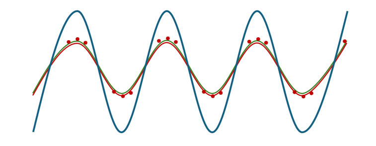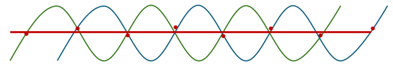 Figure 1 – The red and green lines augment each other to form the constructive interference blue line